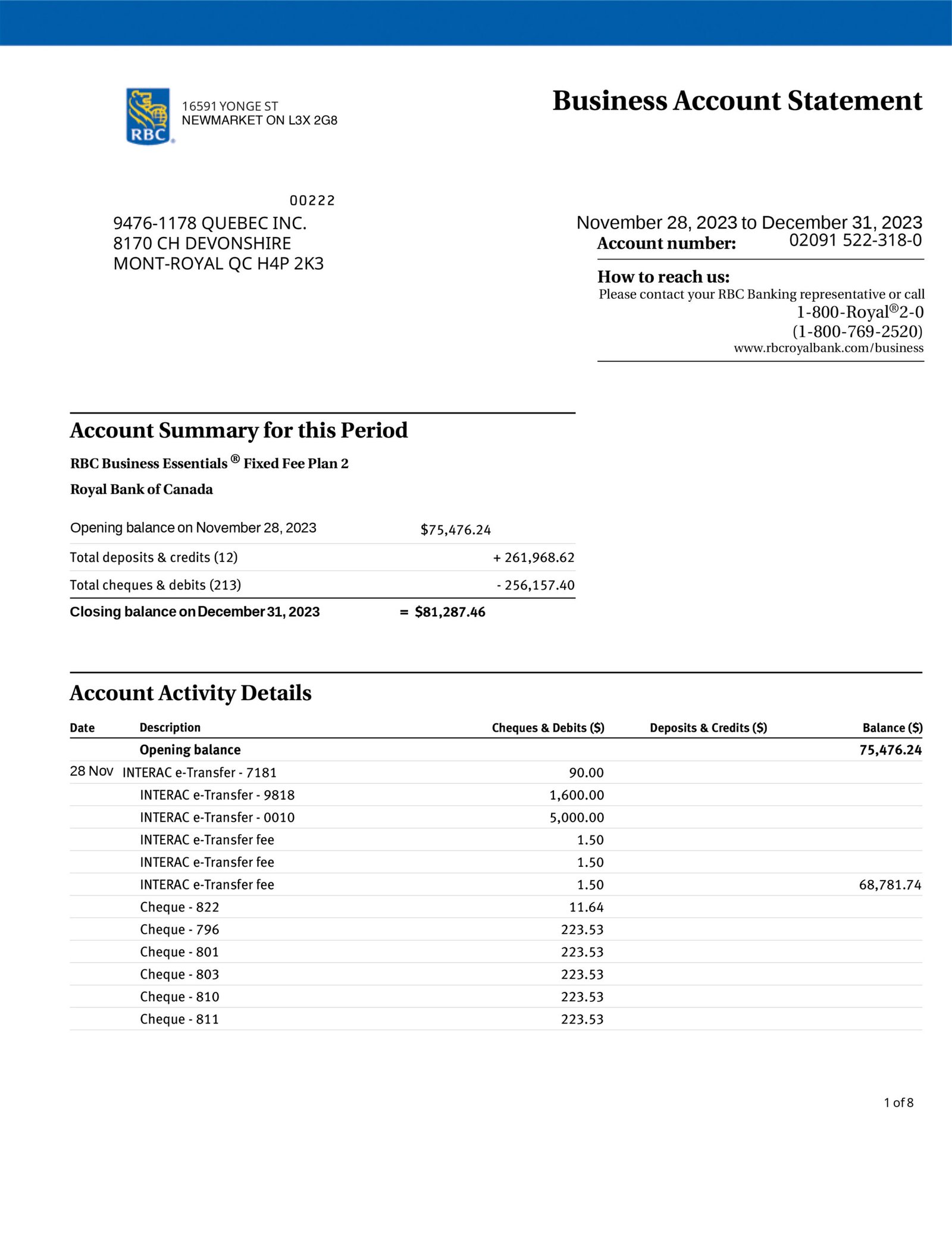 Canada RBC Business Statement Formatting Services
